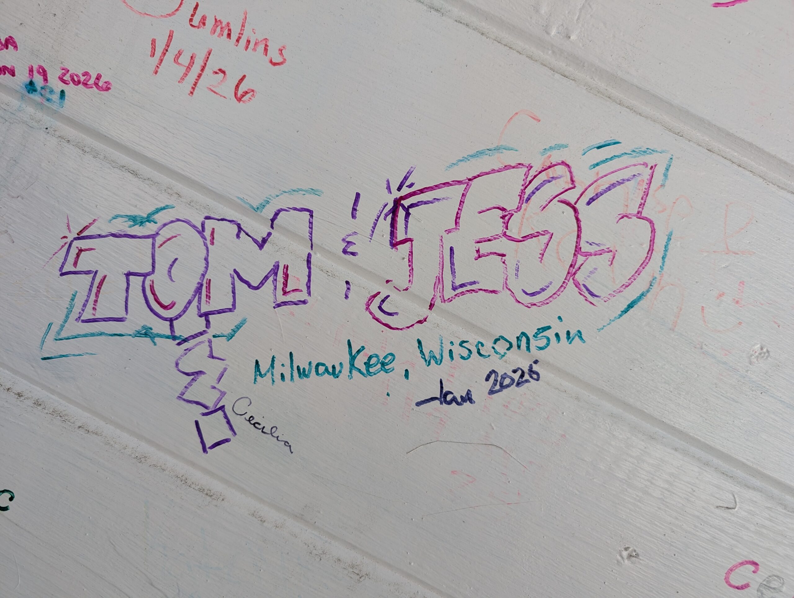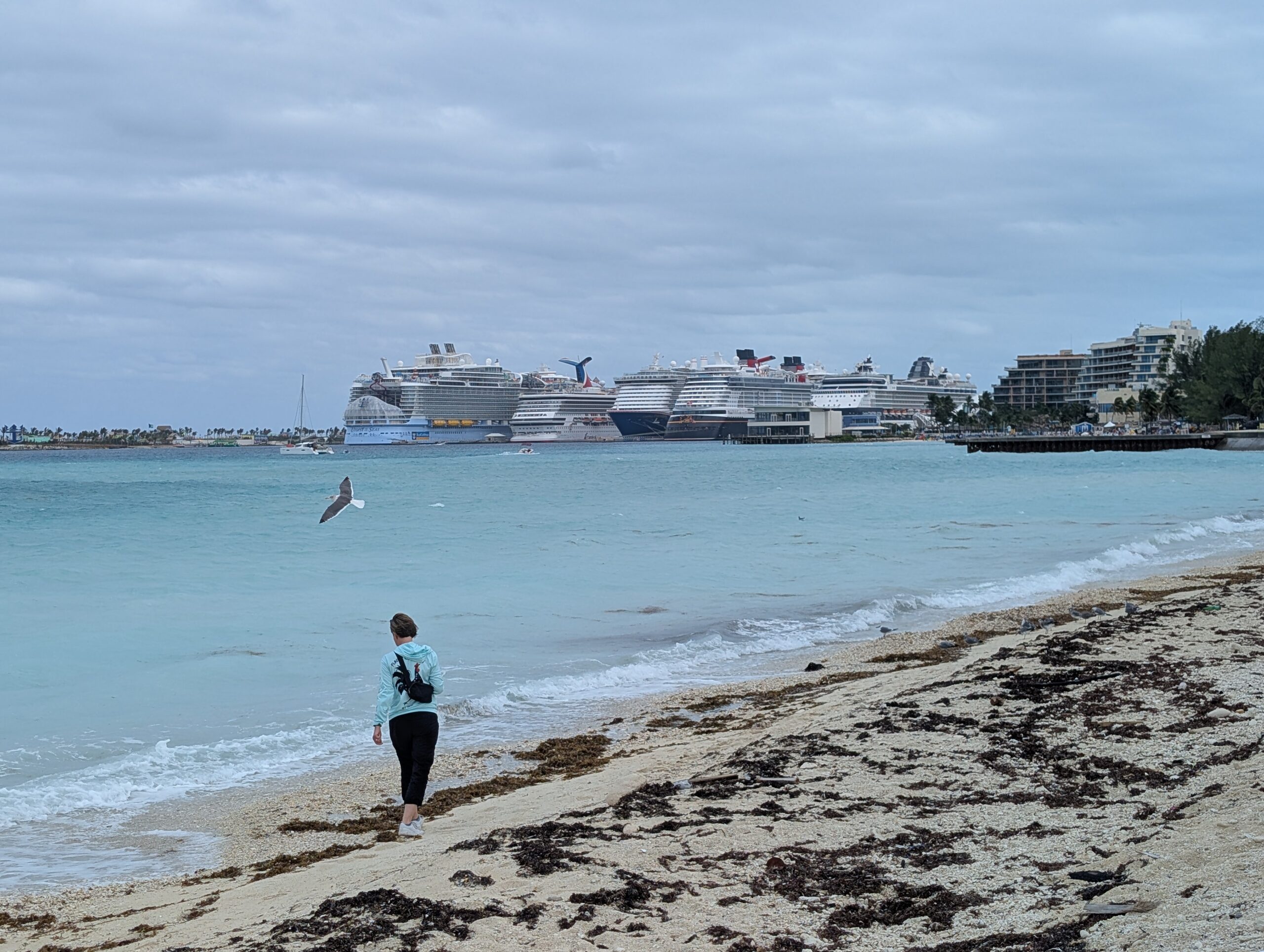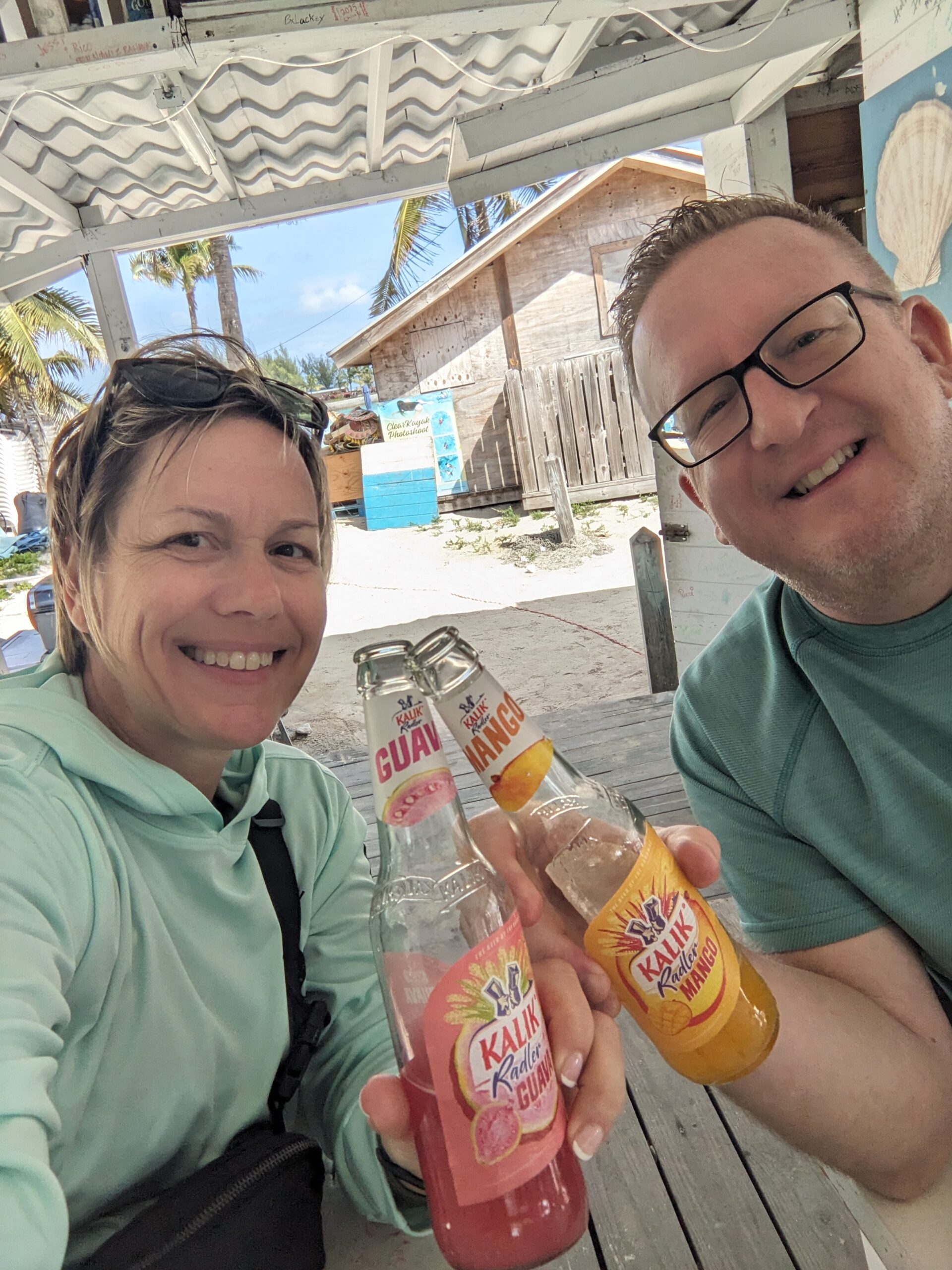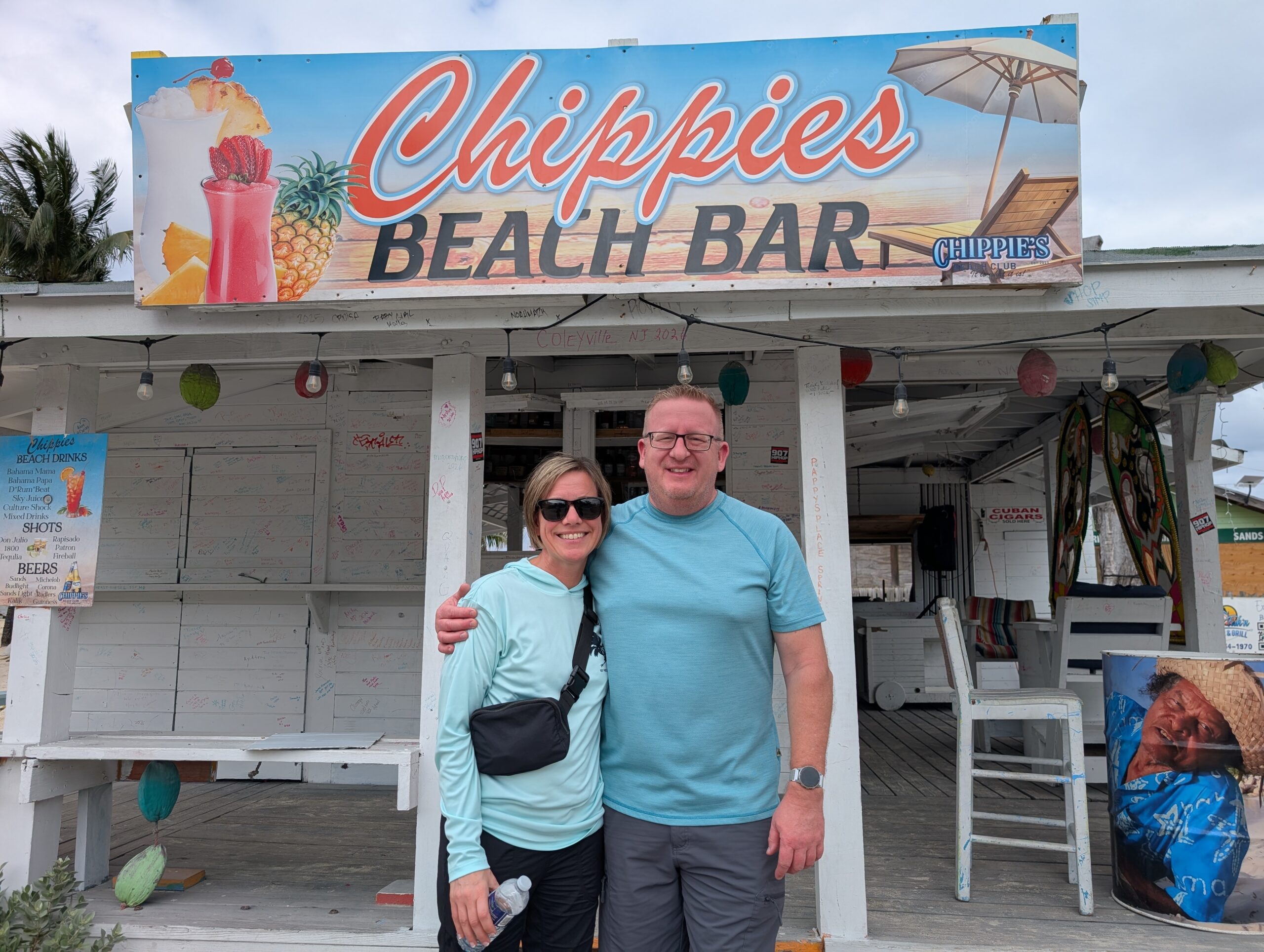 From the fort we walked over to Junkanoo Beach. We stopped at a small beach bar for a drink. This was one of those locations where they encourage you to leave your mark on their building so Tom got to work applying his graffiti. The weather was a little cool so the beach and bar were not booming, but we still enjoyed our time there. Upon leaving the bar we walked down to the end of the beach while I looked for sea glass along the way. I picked up a few pieces but didn’t find anything super spectacular or rare.