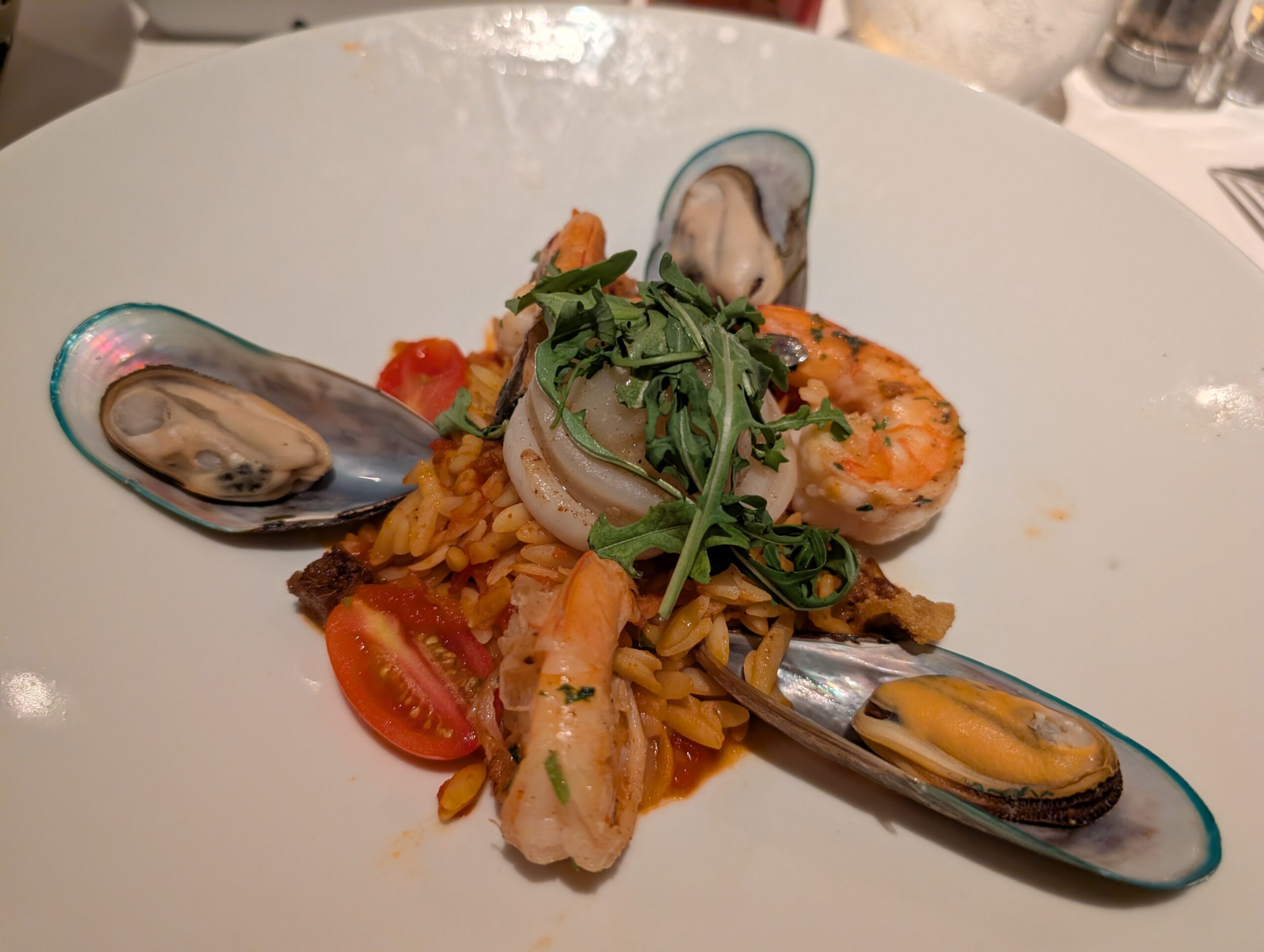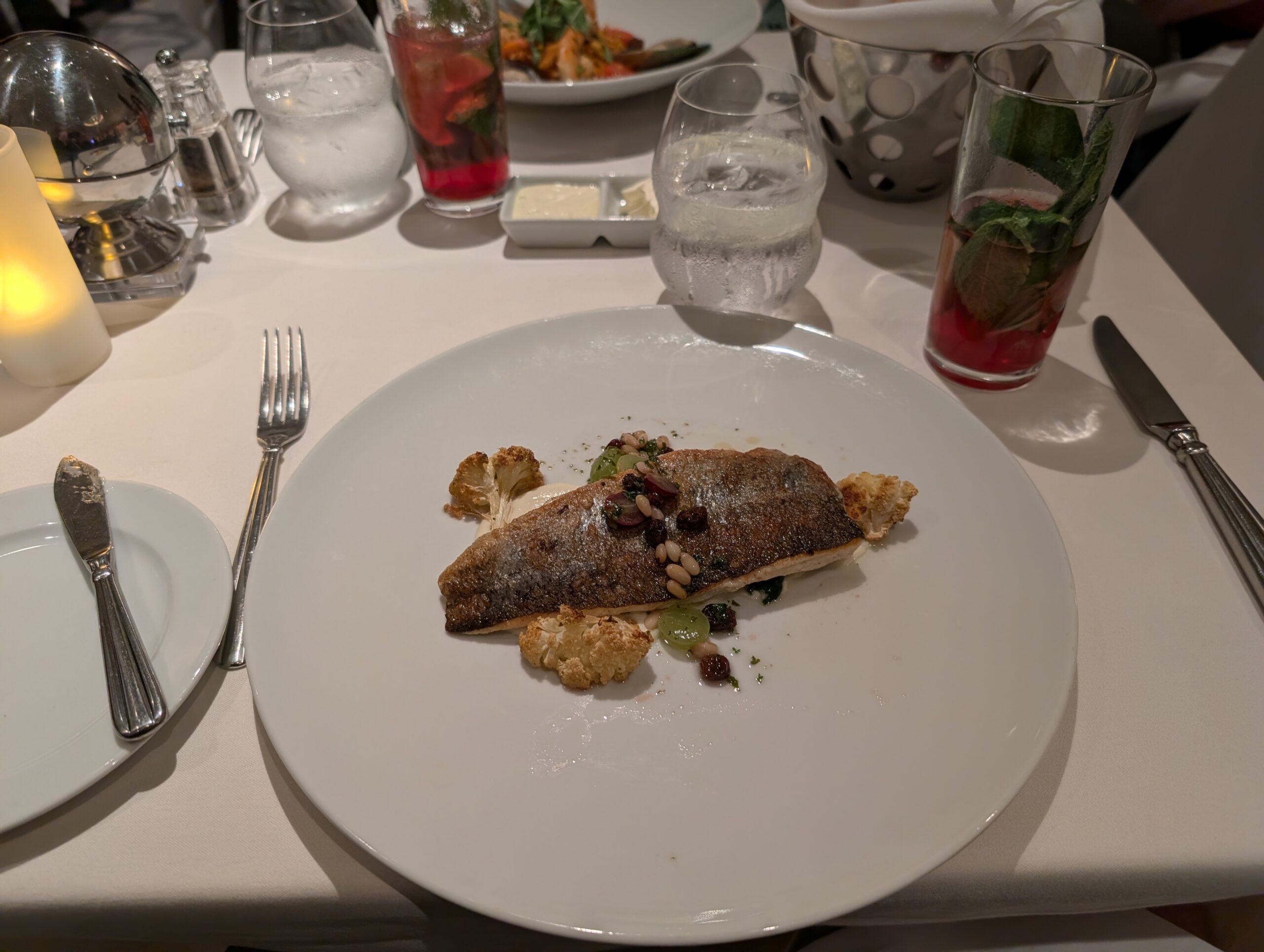 At dinner we sat at a table for 2 but made conversation with a woman named Missy who was eating by herself at the table next to us. She was super friendly and open on sharing her journey with bells palsy. One day out of the blue about a year ago her lip started to droop. The doctors said that just as quickly as it came on, one day it will just go away. We also talked to another couple who was from Colorado. The woman was somewhat annoying and the man seemed dead inside. Actually as I am writing this it is a week after the cruise and I can’t even picture their faces, but am just going off the notes we wrote at the end of the night. I had the seafood pasta and Tom had the trout. We were both happy with our meals.