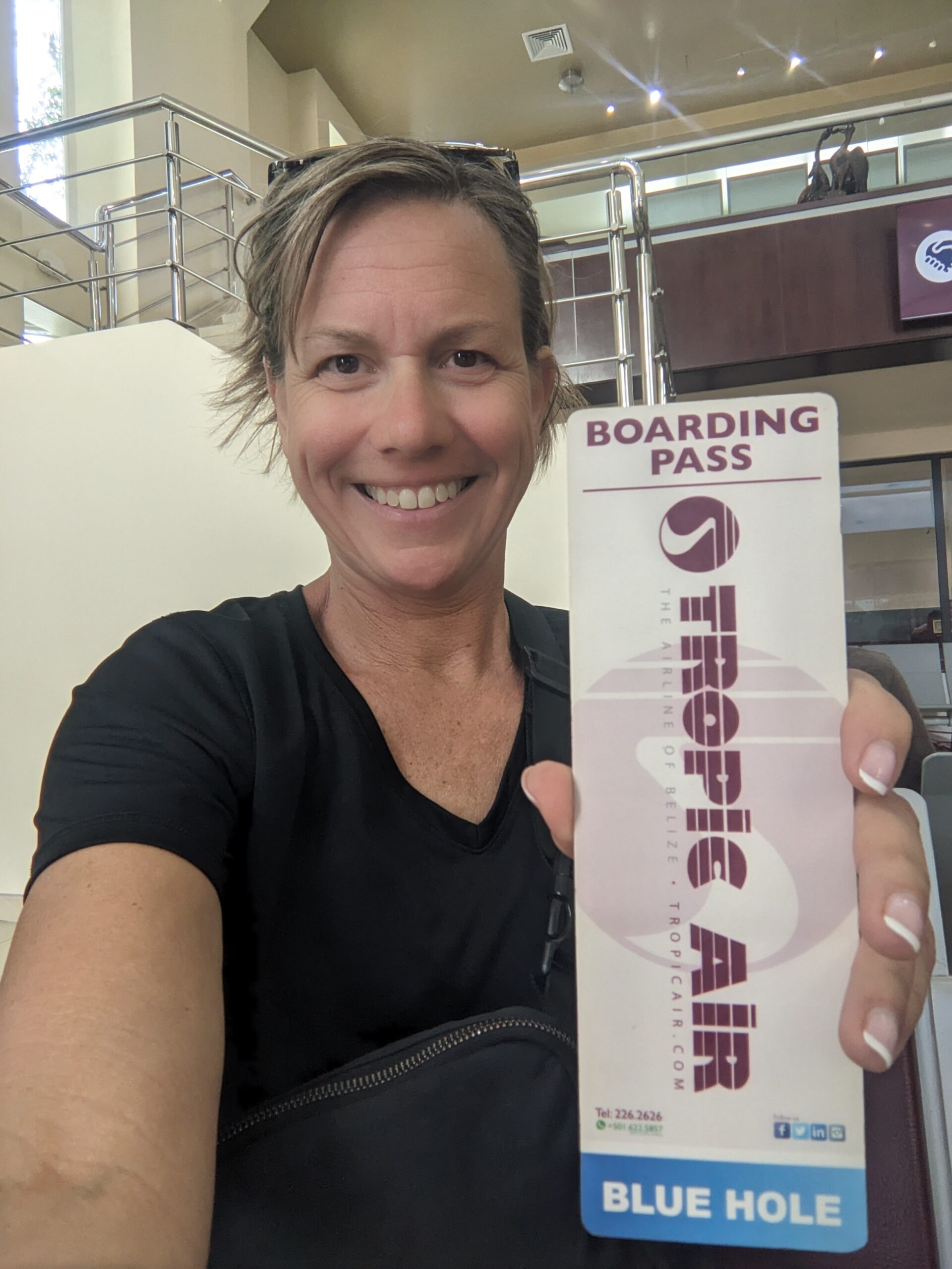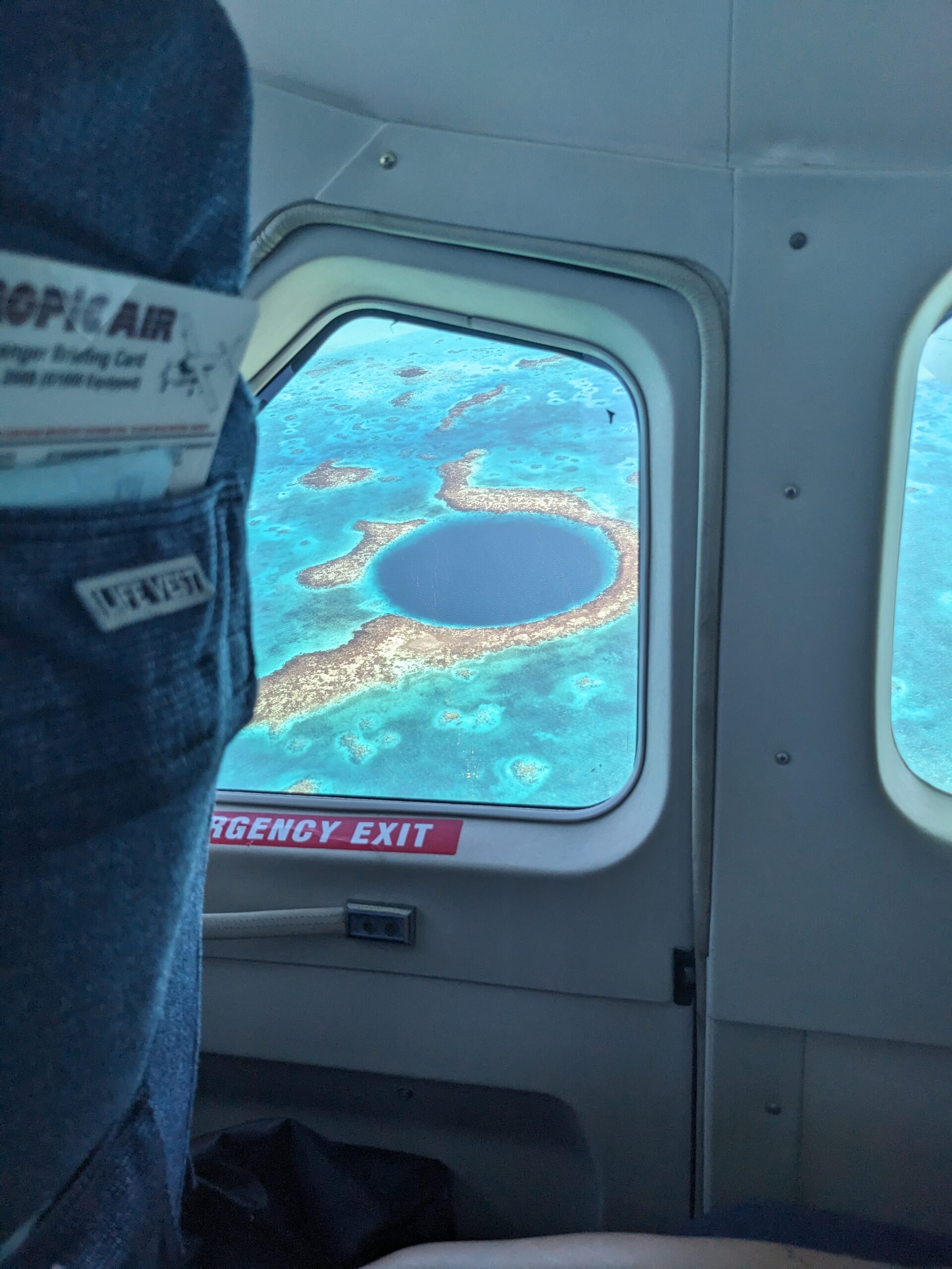 I woke up around 7:00 and felt pretty rested. I honestly still felt full from the nachos yesterday so I didn’t eat anything at the house and got ready for the day. Linda and I walked to town and ate at La Sanpedrana Bar and Grill on the beach. We shared an order of fry jacks, which is a staple breakfast food in Belize, consisting of deep-fried dough pieces that are crispy on the outside and soft, fluffy, and slightly hollow on the inside. We put a little powdered surgar on them and dipped them in jelly. They were very good. How did I wait until the last day I was here to try them? Luckily we left with plenty of time before my excursion because I forget how slow the service on the caye can be. By the time we were done at the restaraunt it was time to take the short stroll over to the airport for my Great Blue Hole tour. The Great Blue Hole is a massive, circular marine sinkhole measuring ~1,000 feet across and over 400 feet deep and is a UNESCO World Heritage Site.