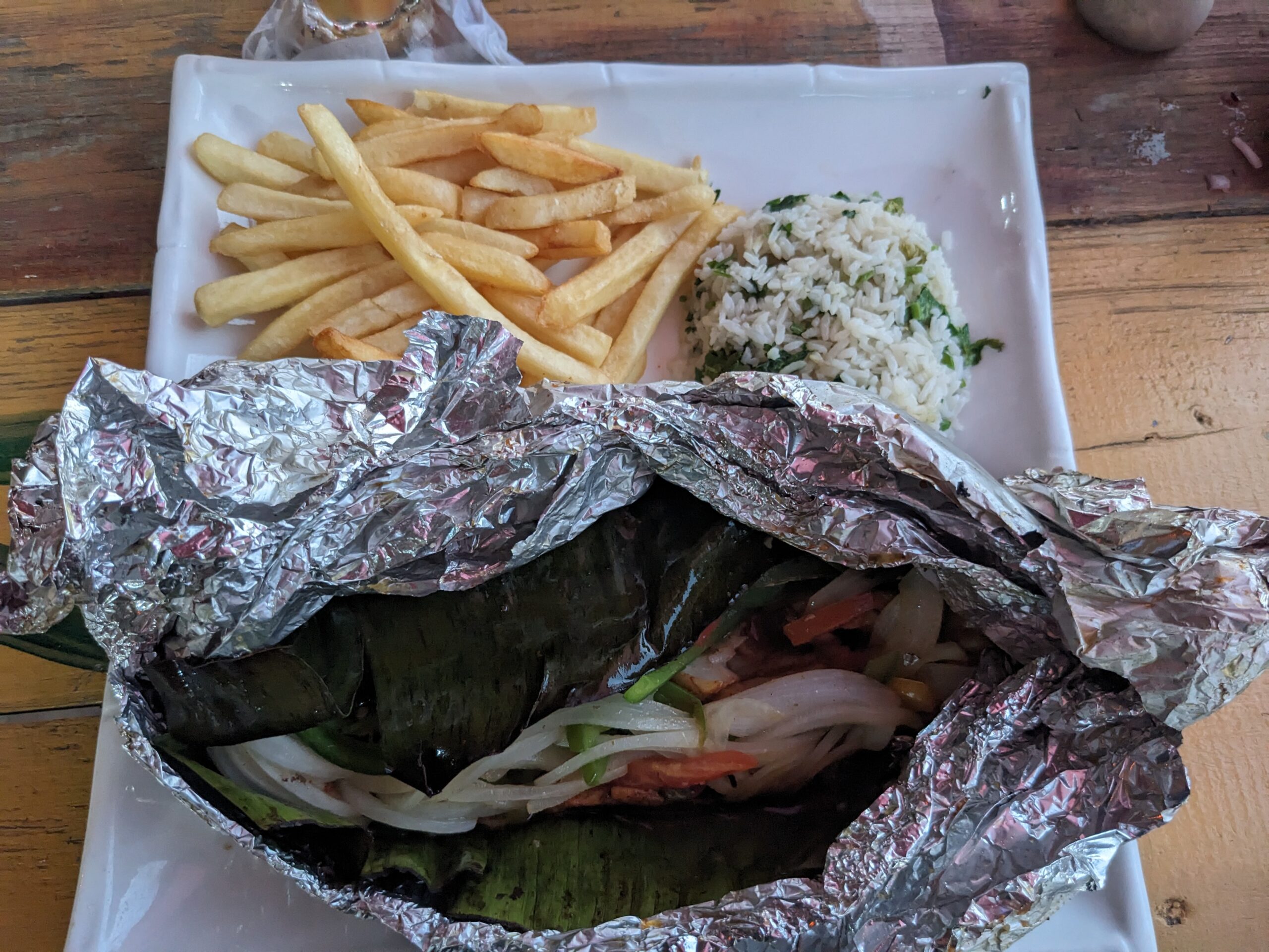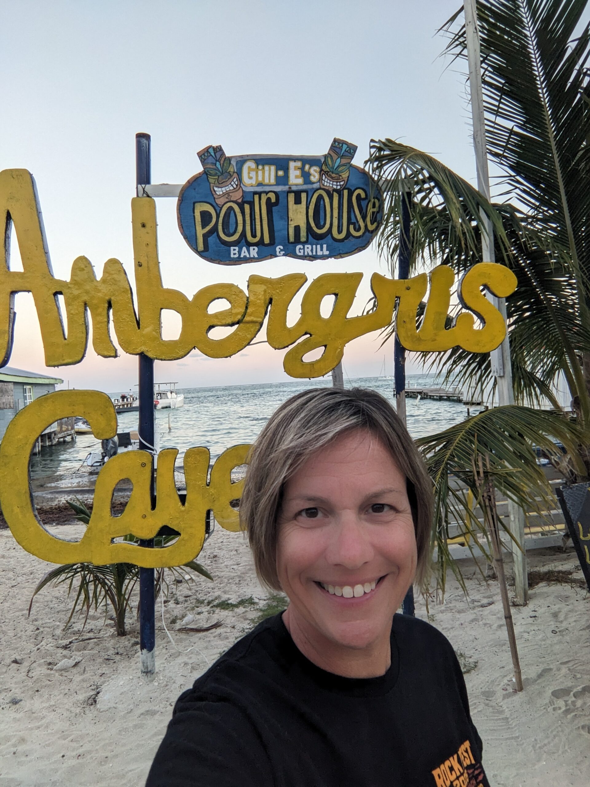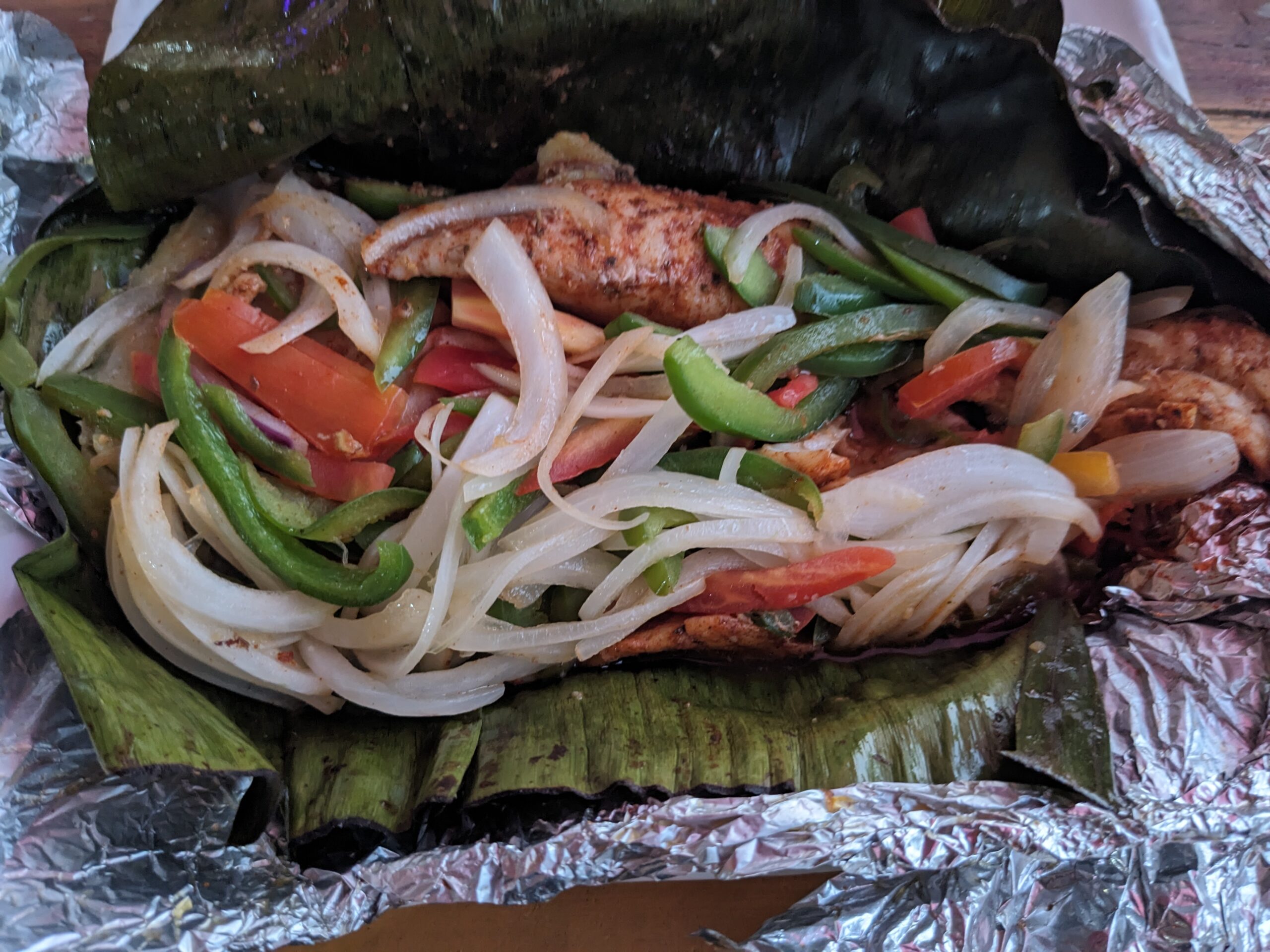 Back at the apartment we showered up and started a load of laundry. Laurie, Linda, and I went on the hunt for some dinner. We ended up at Gill-E’s Pour House (https://gillespourhouse.com) on the beach. We had chips and pico de gallo for an appetizer that was pretty good. I had the fish in the Maya Style Banana Leaf. It was really good although I was disappointed that they were out of the steam vegetables for the choice of one of my sides. It did come with a million peppers and onions that we boxed up along with a bunch of french fries that we took back to Pete who ate them. I also enjoyed feeding bits of our food to a cat who looks like Vector.